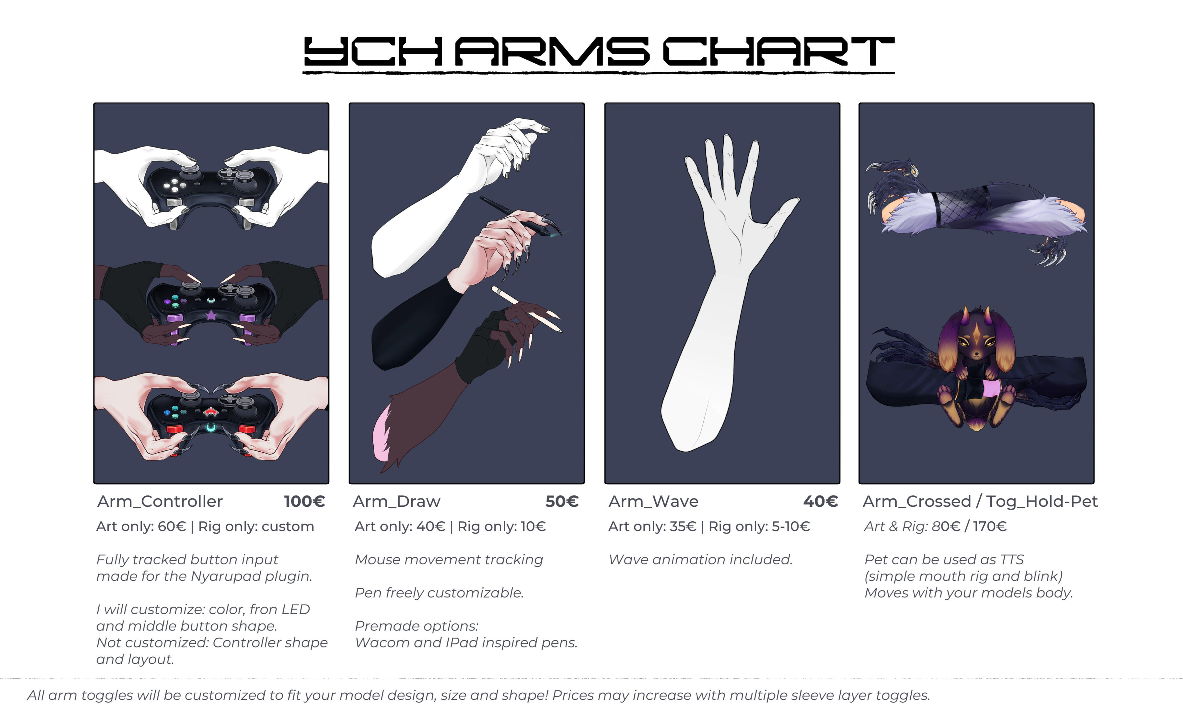 | Extra arm (Depends on sleeves) | 50€ + | 20 € + |
